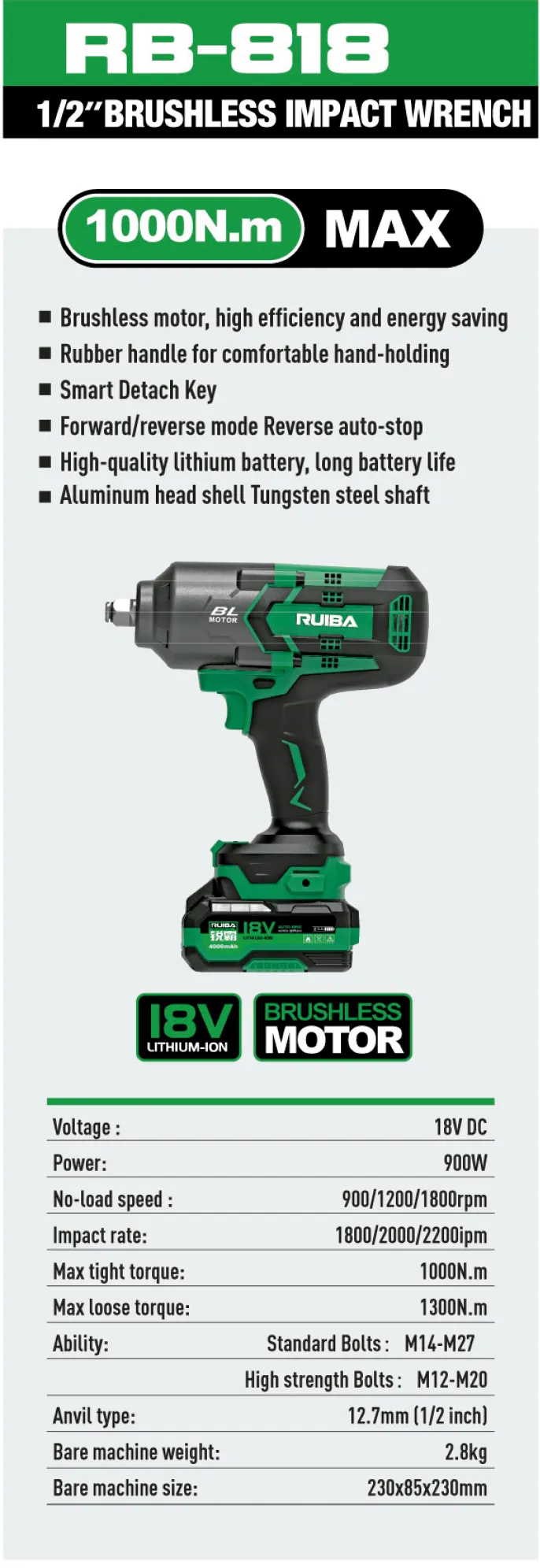Llave de impacto inteligente equipada con motor sin escobillas de alta eficiencia que garantiza un rendimiento superior y un notable ahorro de energía. Incorpora un mango de goma ergonómico que proporciona un agarre cómodo y seguro durante el uso. Dispone de modo de avance y retroceso con parada automática en reversa, lo que facilita el desmontaje con precisión. Funciona con batería de litio de alta calidad y larga duración, ofreciendo mayor autonomía en trabajos exigentes. Su cabezal de aluminio, reforzado con eje de acero de tungsteno, asegura máxima resistencia y durabilidad en condiciones intensivas.