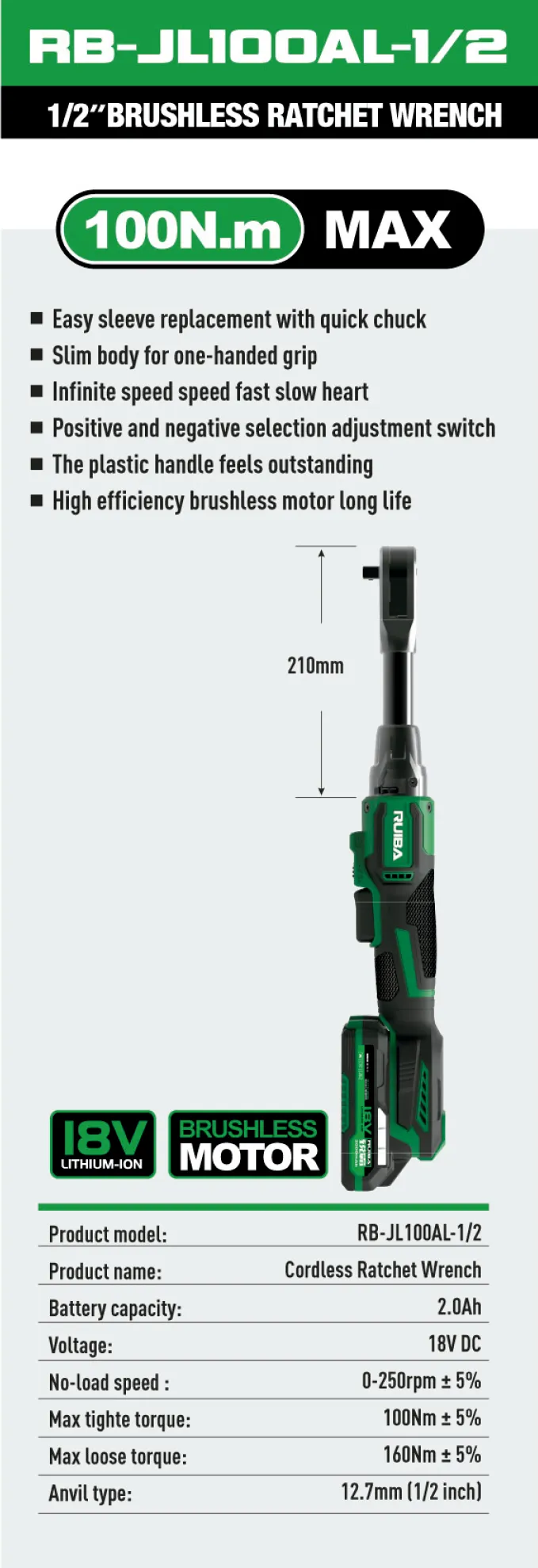 Llave de impacto con mandril rápido que permite el fácil reemplazo de la manga. Su cuerpo delgado está diseñado para ser sostenido con una sola mano, incorporando control de velocidad infinita (rápido/lento) y un interruptor de selección positivo/negativo para mayor precisión. Equipada con un mango de goma de excelente tacto y un motor sin escobillas de alta eficiencia, asegura un rendimiento óptimo y una larga vida útil.